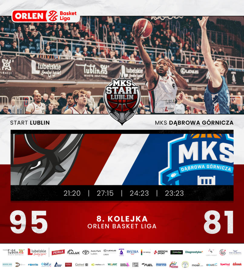 Za nami 8 kolejka Orlen Basket ligi. Po przerwie od spotkań ligowych MKS Start Lublin zalicza udany powrót, wygrywając z MKS Dąbrową Górniczą 95:81 na własnym parkiecie.