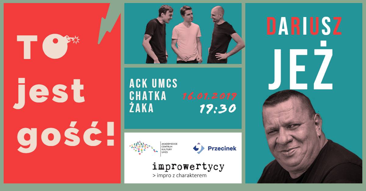 „To jest gość!” z udziałem Dariusza Jeża rusza 16 stycznia o 19:30 w Chatce Żaka. Organizatorami spotkania są Grupa Improwertycy, Fundacja „Przecinek” oraz ACK UMCS Chatka Żaka. Bilety do nabycia online oraz przy kasie w dniu wydarzenia bezpośrednio przed rozpoczęciem.
