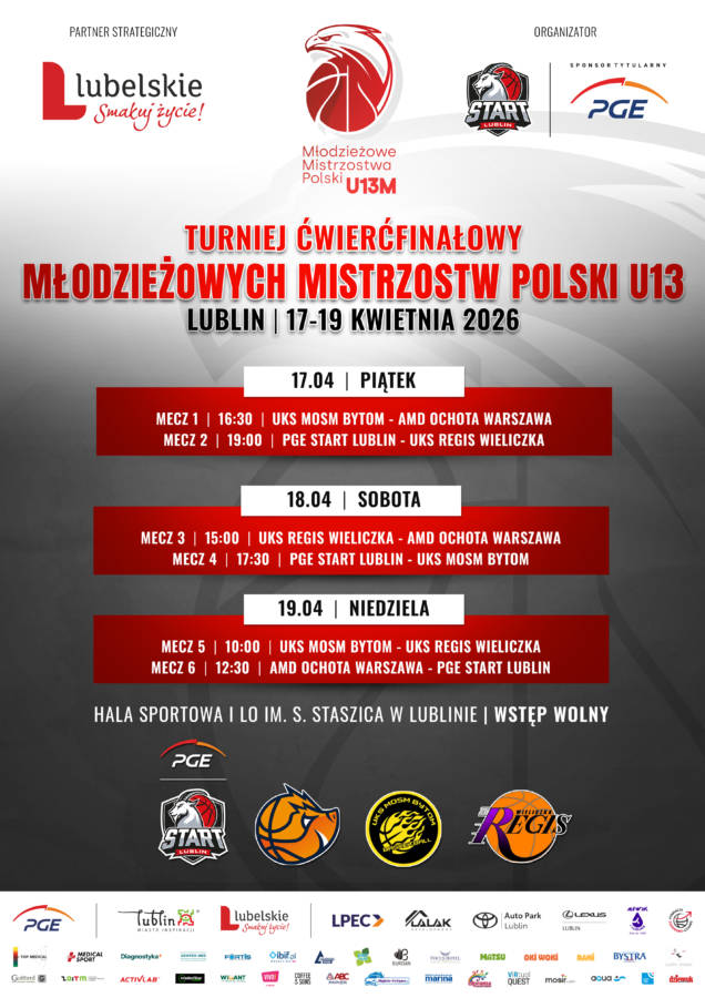 W najbliższy weekend (17.04-19.04) młodzi adepci koszykówki zbiorą się w hali I Liceum Ogólnokształcącego w Lublinie w ramach ćwierćfinałów Mistrzostw Polski U13. Oprócz gospodarzy, a więc PGE Startu Lublin, trzy inne drużyny powalczą o awans do kolejnej fazy.